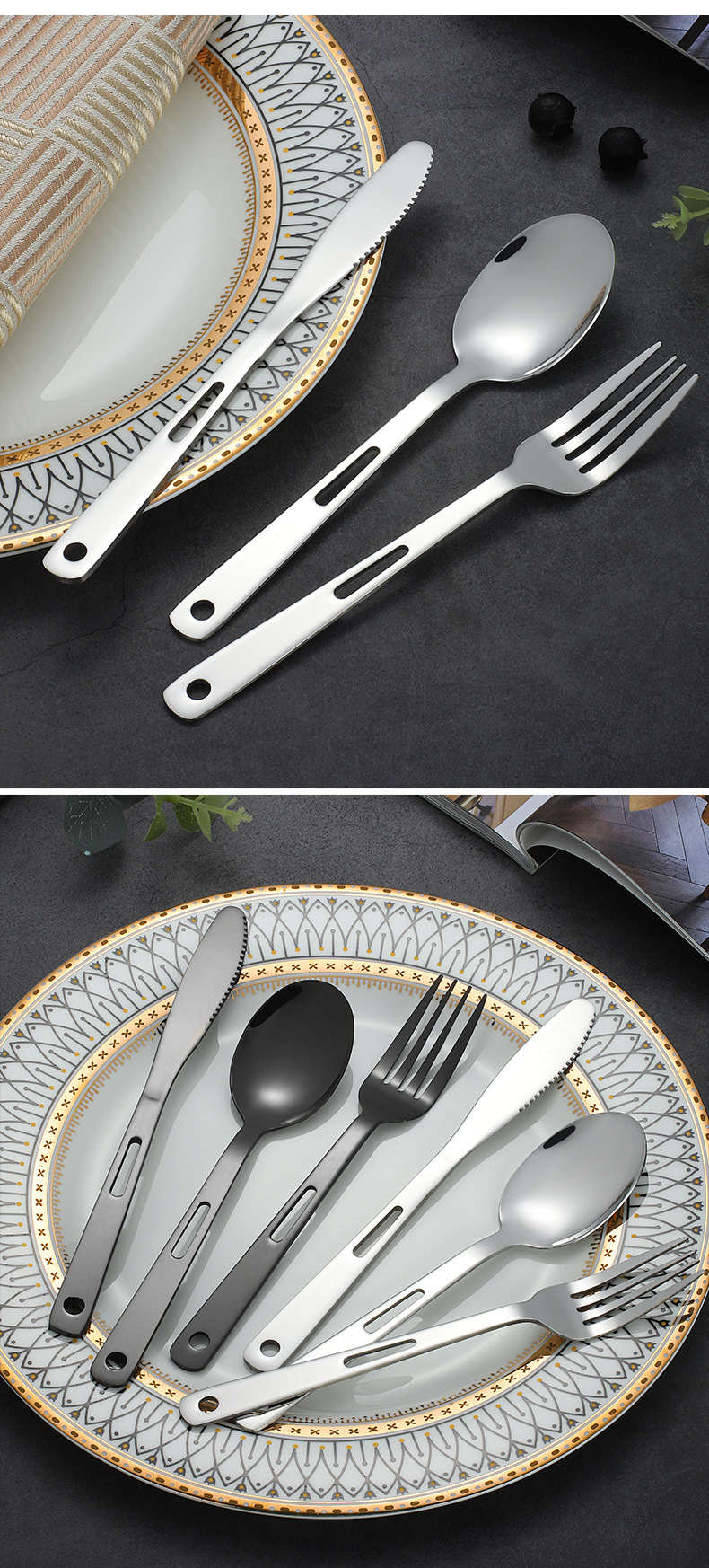 Silver 3-piece set | Black 3-piece set | Silver table knife | Silver spoon | Silver fork